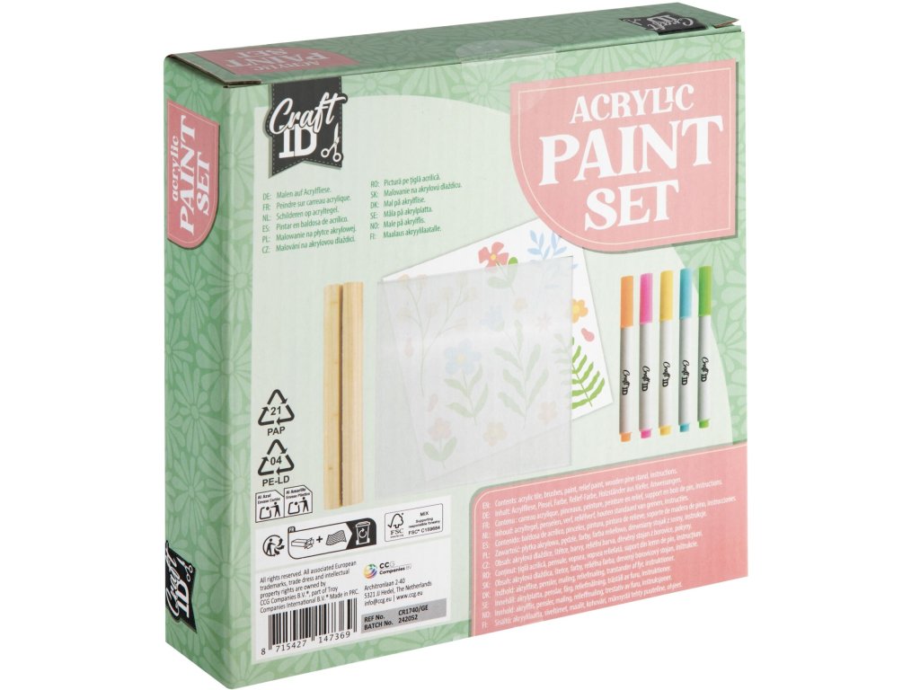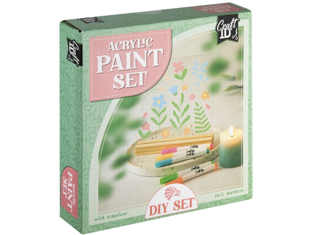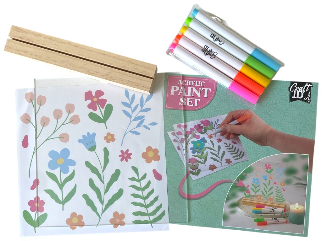 Objevte kouzlo tvoření s akrylovou sadou Craft ID! 🎨 Tento kreativní set obsahuje vše, co potřebujete k malování veselých květinových motivů – barevné akrylové fixyfixy na sklo a keramiku, květinovou šablonu na průhledném podkladu a praktický dřevěný stojánek pro vystavení hotového díla.