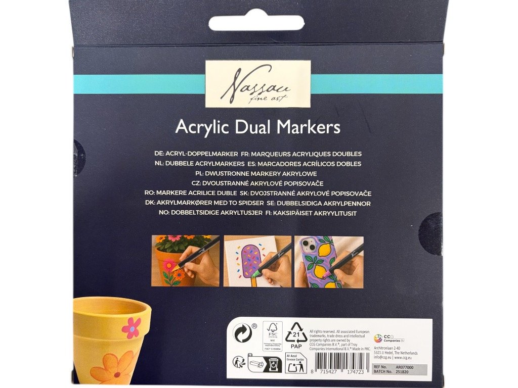 Sada 12 akrylových fixů s dvojitým hrotem (1 mm a 5 mm) nabízí syté, krycí barvy pro kreslení, dekorování a DIY projekty na různé povrchy.
