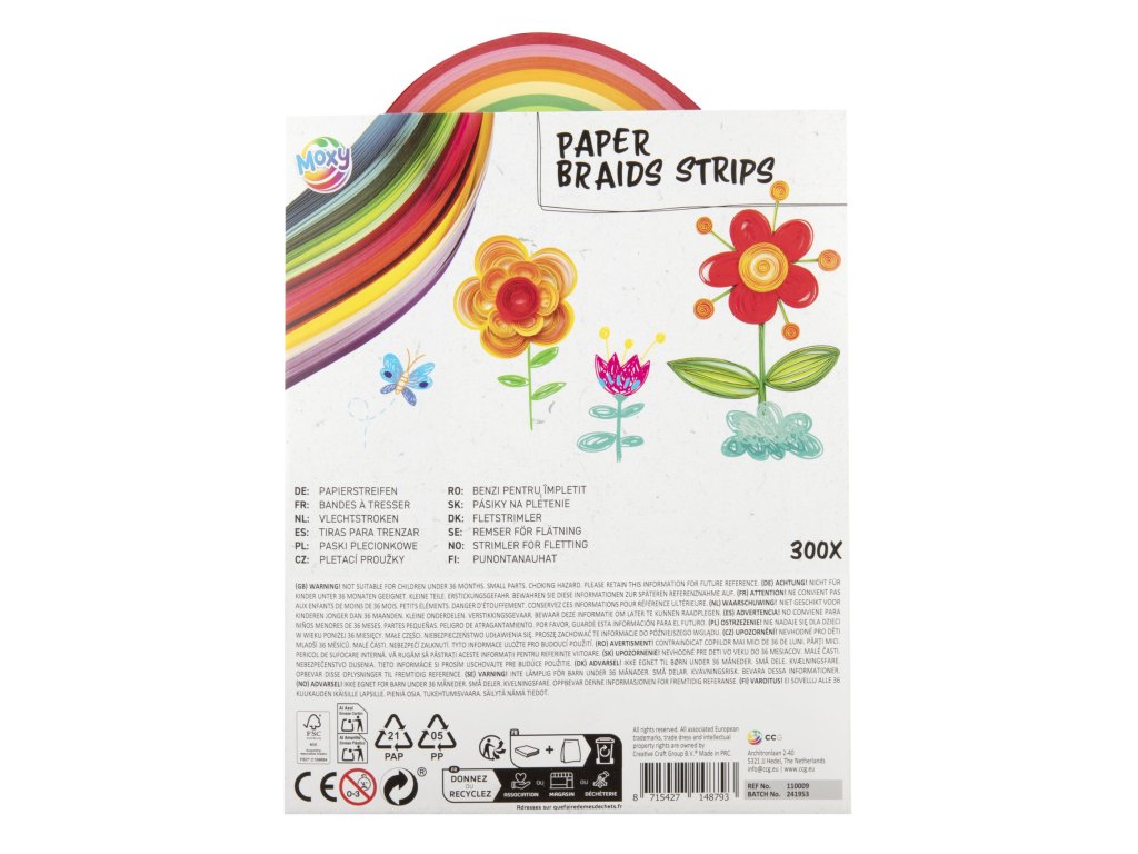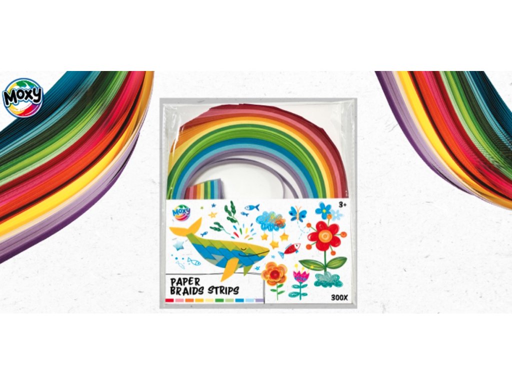 Balení obsahuje 300 kusů papírových proužků v různých živých barvách. Proužky mají ideální rozměry pro snadnou manipulaci a tvarování. Jsou vyrobené z kvalitního papíru, který se snadno roluje, lepí a drží tvar.