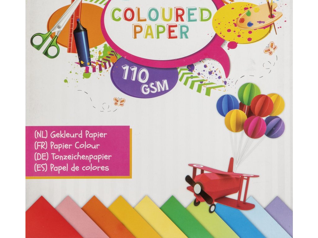 Balení obsahuje 30 listů A4 (21 x 29,7 cm) s gramáži 110 g/m2, barvy: červená, růžová, oranžová, žlutá, sv. žlutá, tm. zelená, sv. zelená, tm. modrá, sv. modrá, fialová.
