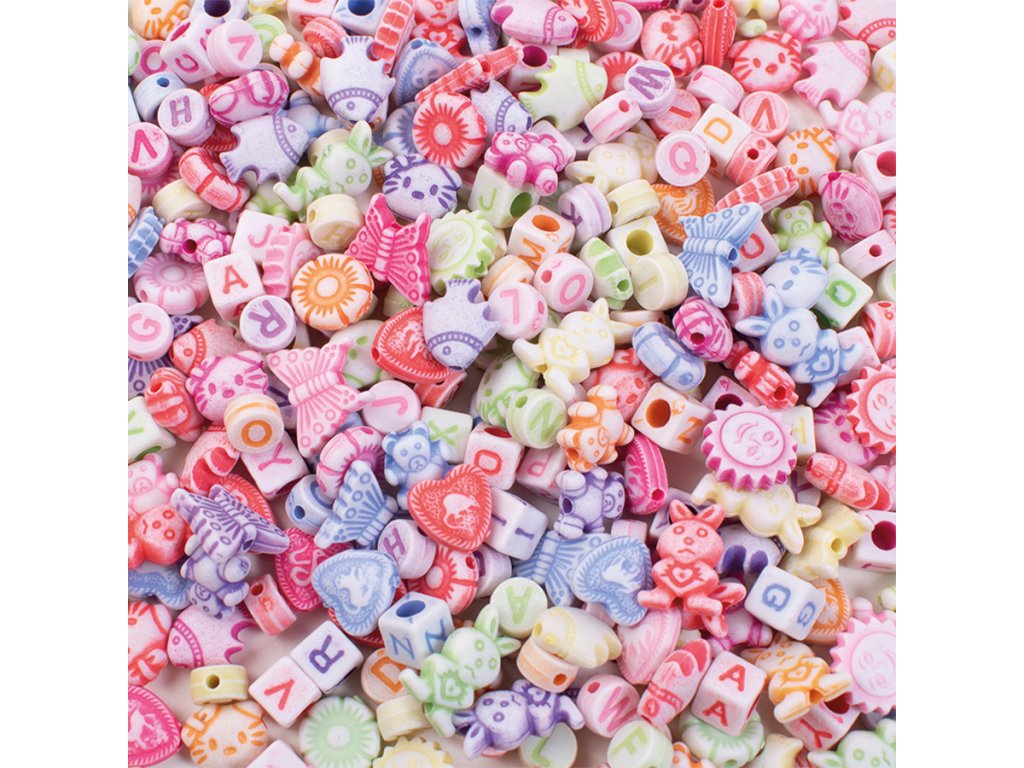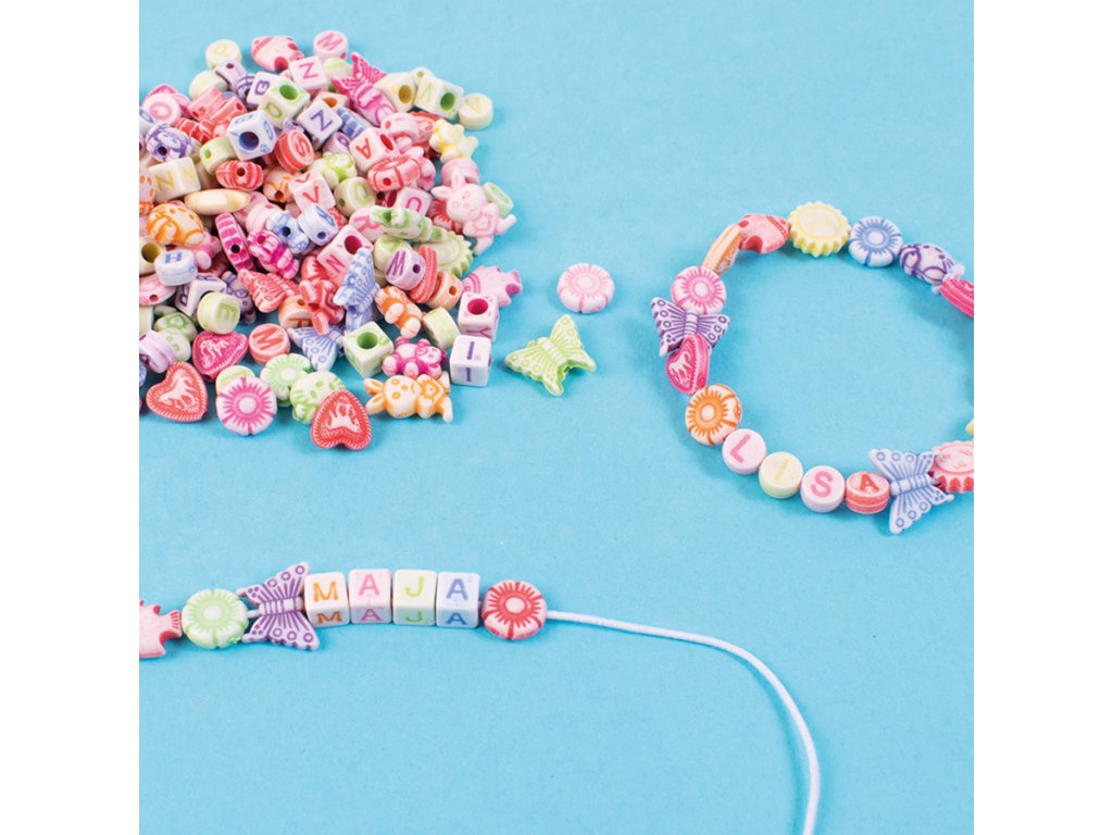 V balení jsou korálky v jemných pastelových barvách s různými tvary a písmeny, která podporuje kreativitu i učení jazyků. Kombinací barev a tvarů si děti mohou hravou a poutavou formou procvičovat jemnou motoriku, rozpoznávání písmen a pravopis. Ideální pro vytváření personalizovaných šperků a učení se novým slovům.
