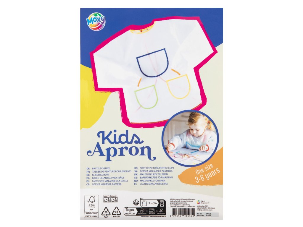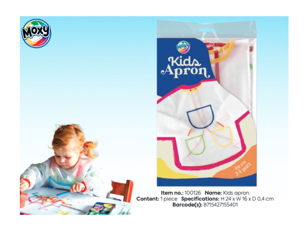Zástěrka je v univerzální velikosti "one size", která je vhodná pro děti ve věku 3–6 let. Má praktické šňůrky na zavazování a pomáhá udržet barvy, lepidlo a další nepořádek mimo oblečení. Je ideální pro školku, školu nebo domácí tvoření.