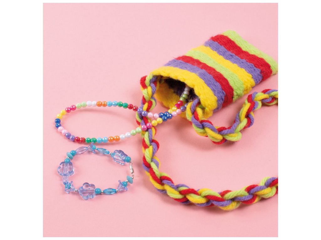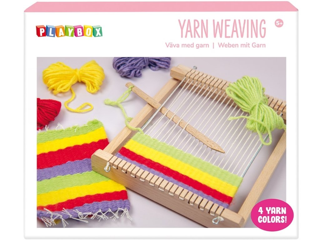 Tkalcovský stav obsahuje také 8 metrů barevné příze ve čtyřech veselých odstínech – žlutá, fialová, světle zelená a červená. Děti si tak mohou vytvořit své vlastní barevné vzory a kombinace.