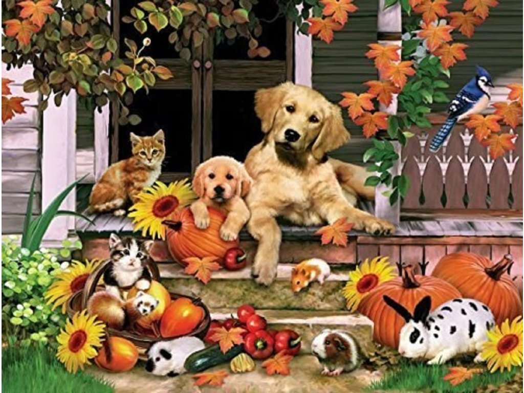 Diamantový obrázek - Domácí mazlíčci před domem 30x40 cm