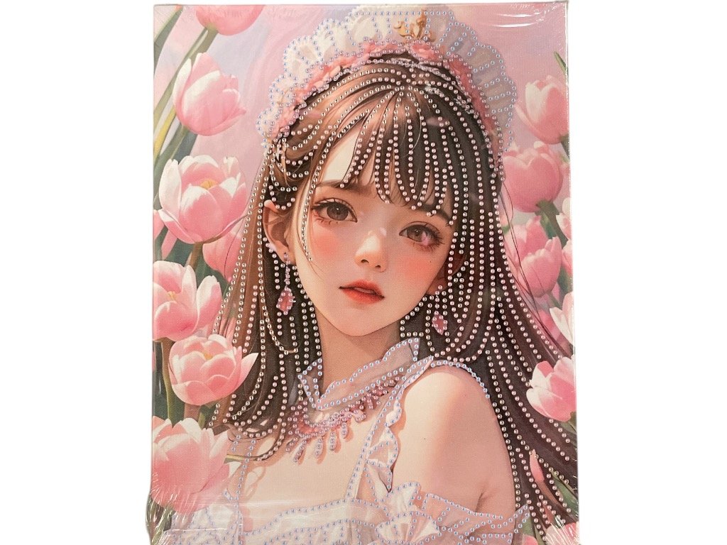 Vytvořte si vlastní třpytivý umělecký kousek s diamantovým malováním! Tento set obsahuje plátno o velikosti 23 × 30 cm s motivem brunetky ozdobené květinami.