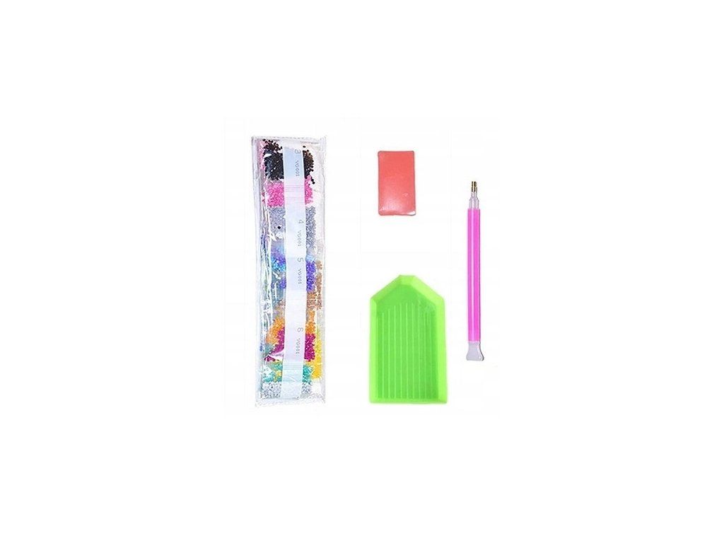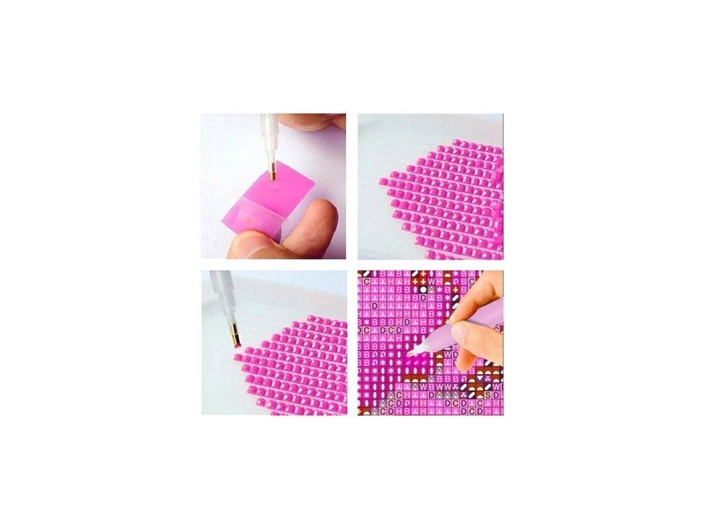 Postup: Obrázek je zakrytý ochrannou folii, kterou sundávejte vždy postupně, tak jak budete aplikovat kamínky. Při sundání celé folie najednou hrozí, že se ztratí viskozita lepidla a kamínky nebudou držet. Plátno obsahuje označení, která jsou umístěna i na sáčcích s kamínky. Podle označení, víte kam který kamínek patří. Nejprve si do hrotu tužky naberete vosk, díky kterému se kamínky snadno přichytí na pero. Kamínky perem aplikujete na obrázek.