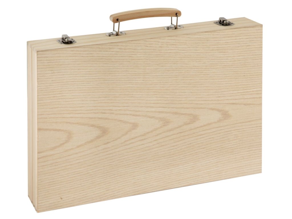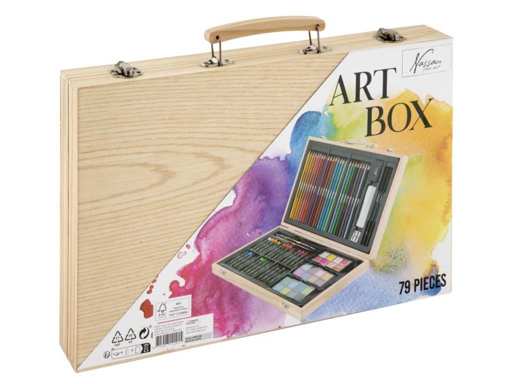 Dřevěný malířský kufr obsahuje 79 ks malířských potřeb – pastelky, fixy, vodové barvy, voskovky, pastely.