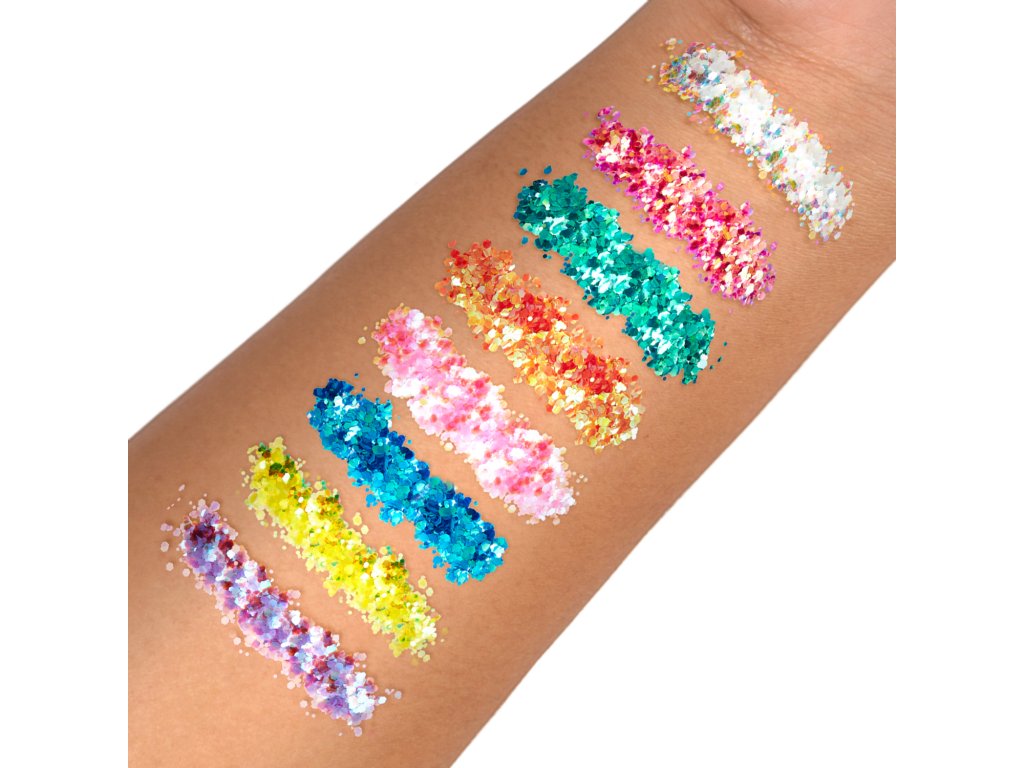 Gel obsahuje vysoce intenzivní pigmenty a velké třpytivé částice, které vytvářejí oslnivý duhový efekt pod každým světlem. Vhodný je pro obličej i tělo, a to i pro citlivou pokožku.