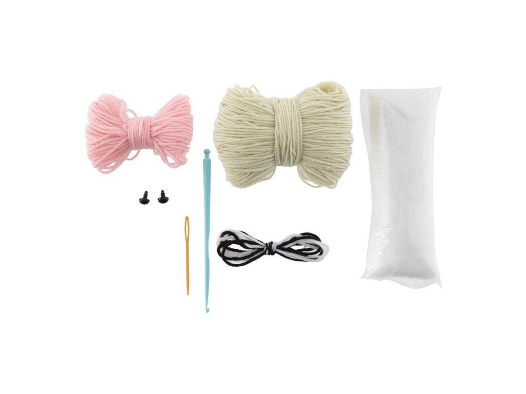 - béžovou, růžovou a černobílou přízi,očíčka výplň, háček a plastovou jehlu.