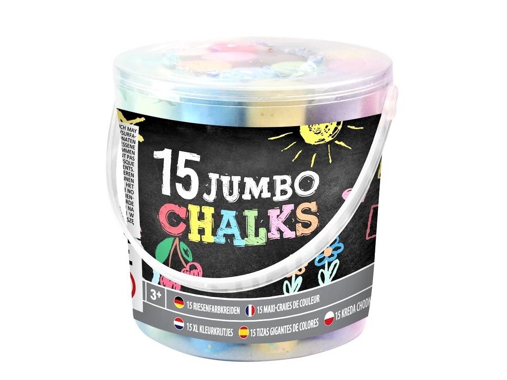 Podpořte dětskou kreativitu s praktickým kbelíkem obsahujícím 15 barevných jumbo kříd na chodník. Tyto pevné křídy jsou ideální pro kreslení na chodníky, dvorky nebo dřevěné podklady.