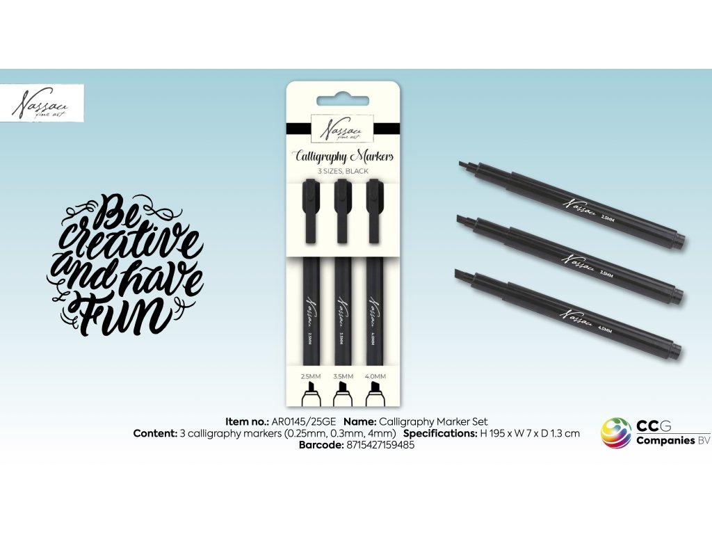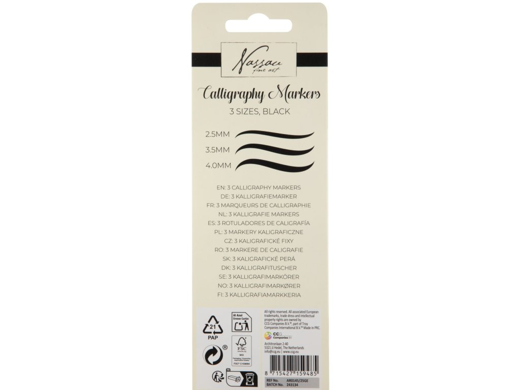 Sada 3 kaligrafických fixů se zkoseným hrotem (2,5 mm, 3,5 mm, 4,0 mm). Ideální pro kaligrafii, scrapbooking a cardmaking.