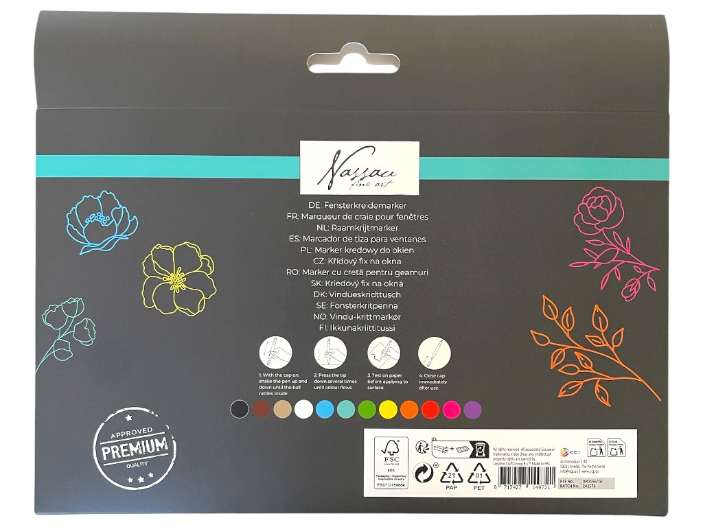 Objevte univerzální křídové fixy na okna Nassau Fine Art – sada 12 barev (bílá, hnědá, béžová, tyrkysová, oranžová, růžová, fialová, černá, modrá, zelená, žlutá, červená) pro děti i dospělé. Díky oboustrannému hrotu (kulatý a zkosený, 3–5 mm) můžete jednoduše tvořit tenké i silné linky podle svého designu.