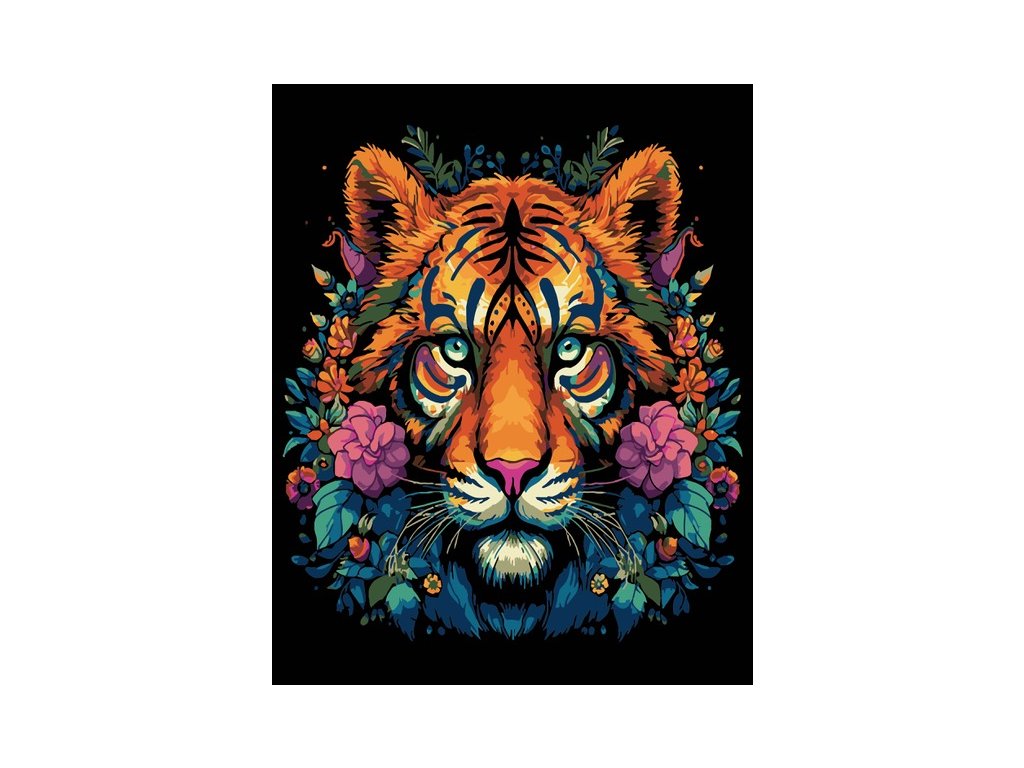 Malování podle čísel na černém plátně (40 x 50 cm) - tygr v květinách