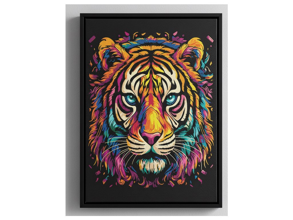 Živá oranžová a sytá černá tygří srsti tvoří ohromující kontrast s tmavým pozadím, což nechává vyniknout jeho pronikavému pohledu a detailním pruhům. Obraz má silný vizuální dopad a stane se nepřehlédnutelným dominantním prvkem každého moderního interiéru.