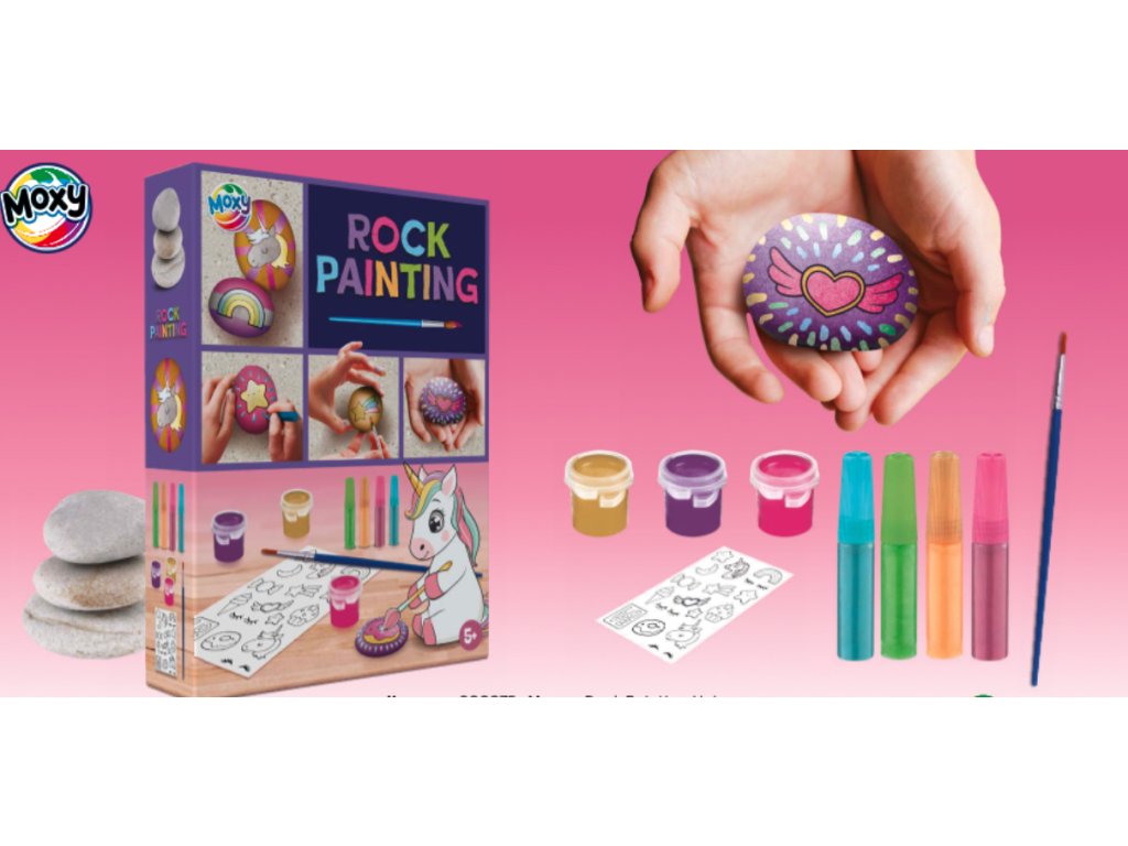 Sada obsahuje 3 hladké kameny připravené k malování. K dispozici máte štětec a sadu barev, které z kamenů udělají duhovou říši. Dokonalý vzhled jednorožce pak snadno vytvoříte pomocí vodou přenosných samolepek, které se na kameny aplikují jednoduše a s přesností.