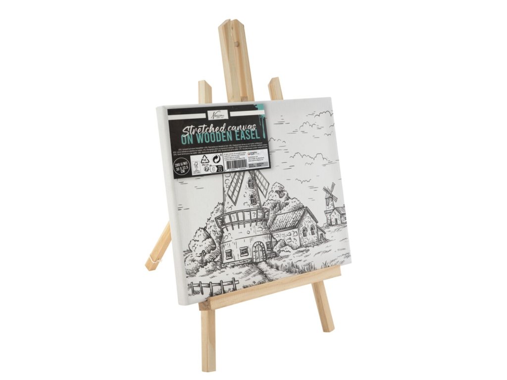 Balení obsahuje: plátno 30 x 22,5 cm s předtištěným motivem, dřevěný stojan