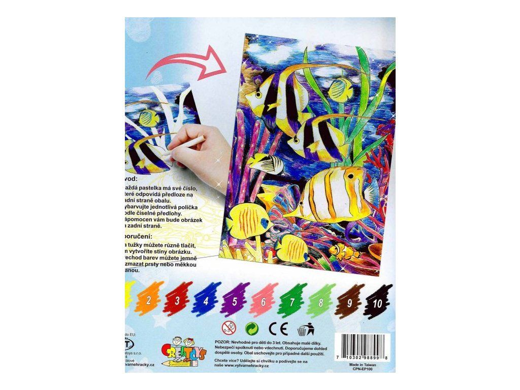 Velikost obrázku 22 x 28,5 cm.V sadě naleznete 10 pastelek, obrázek s obrysy, číselnou předlohu a ořezávátko. Každá barva má své číslo, které odpovídá číselné předloze.Jednotlivá políčka obrázku vybarvujte podle čísel z předlohy. Skvělá zábava pro děti od 6 let.