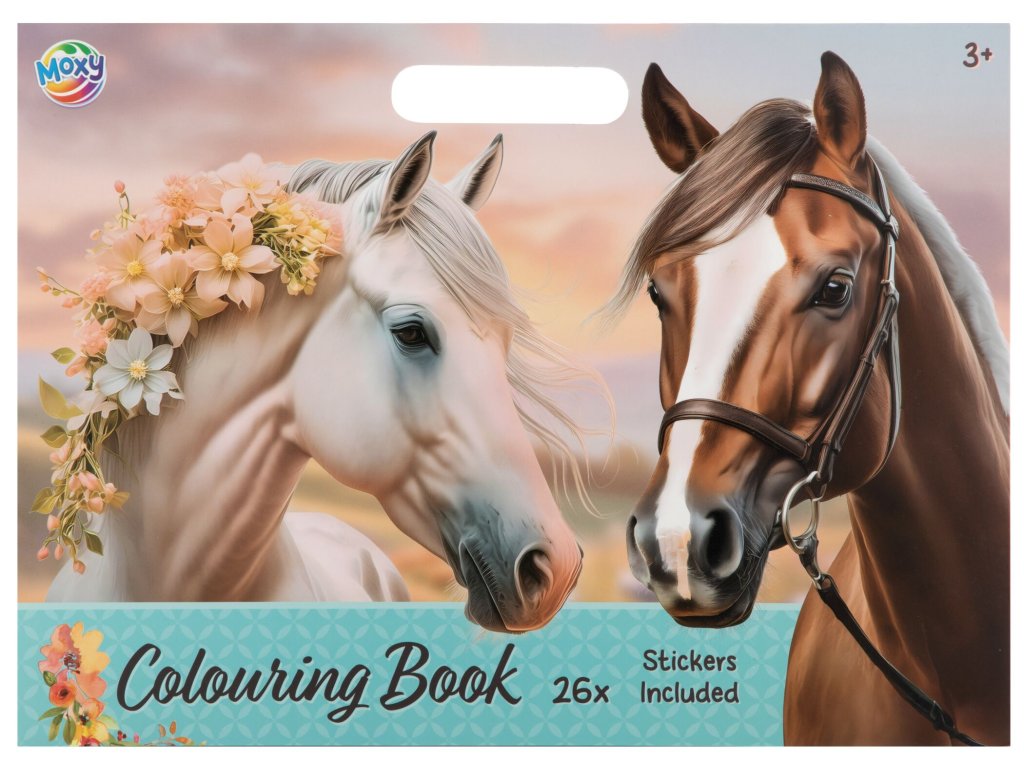 Kniha omalovánek obsahuje 25 listů omalovánek a arch samolepek s motivy koně.
