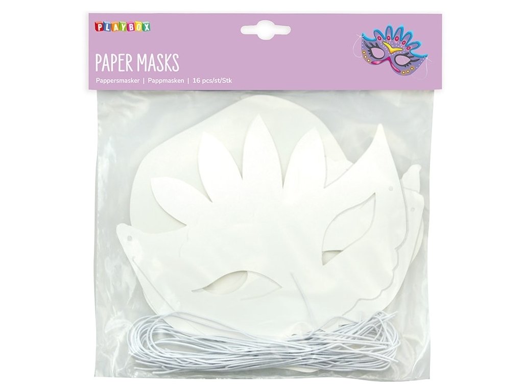 Papírové karnevalové masky. Balení obsahuje 16 ks (5 různých typů) bílých papírových karnevalových masek s bílou gumičkou.