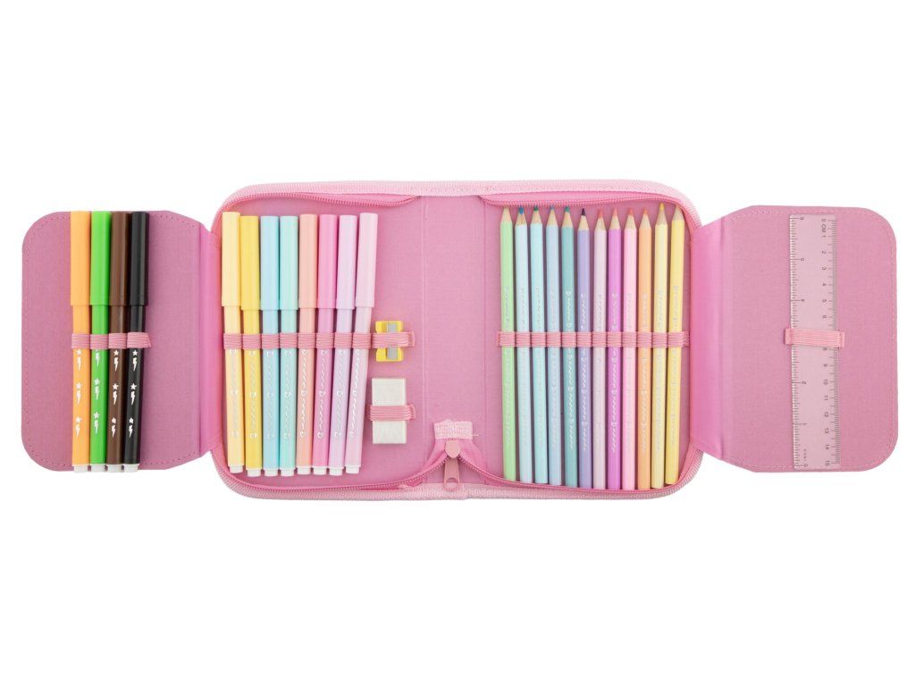 Obsahuje: 12 barevných fixů, 12 pastelek v pastelových barvách, ořezávátko, gumu a pravítko