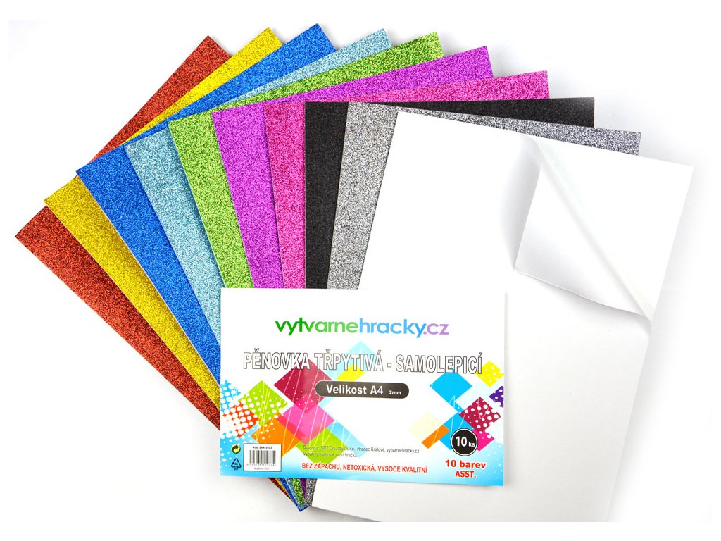 Sada 10 kusů třpytivých samolepicích pěnovek ve formátu A4 (2 mm). Ideální pro kreativní projekty, dekorace, scrapbooking nebo školní práce. Mix barev pro široké možnosti použití.
