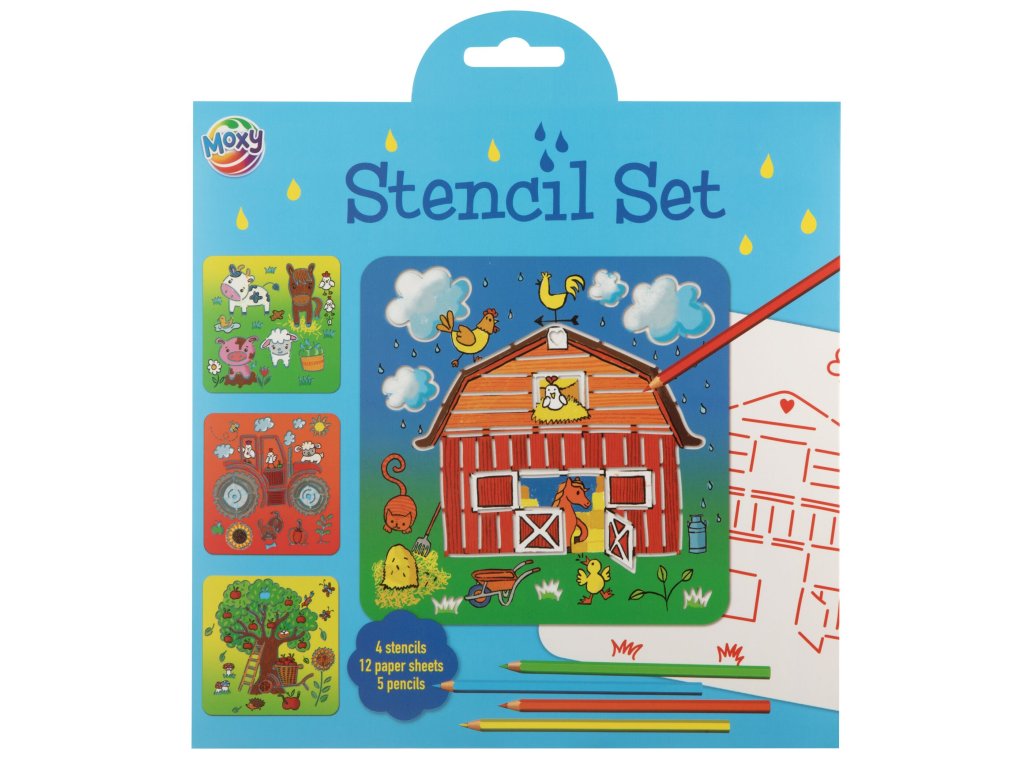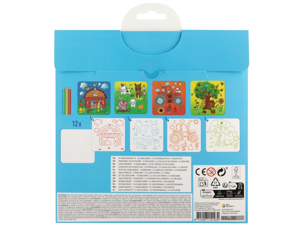 Balení obsahuje 4 různé šablony, 5 pastelek, 12 listů papíru