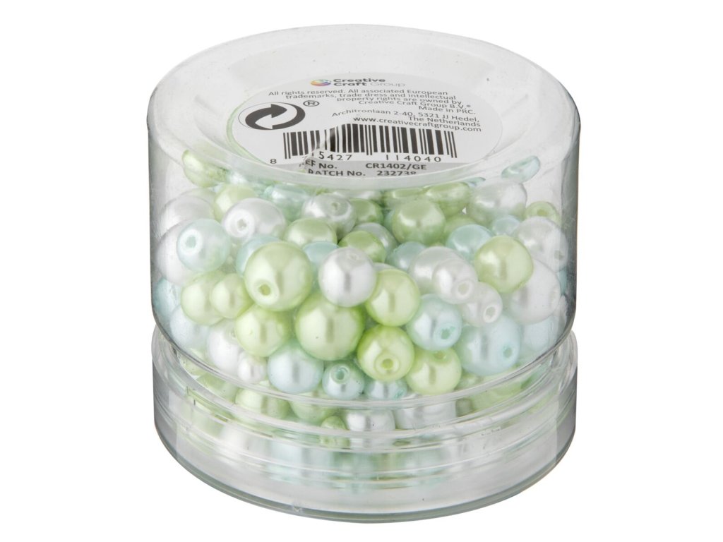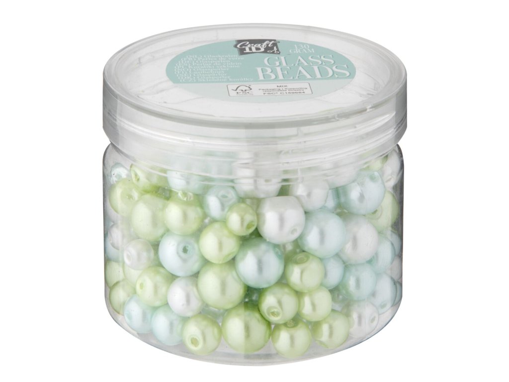 Balení obsahuje 130 g skleněných korálků různých velikostí, cca 1 - 0,5 cm v modrozelených odstínech.
