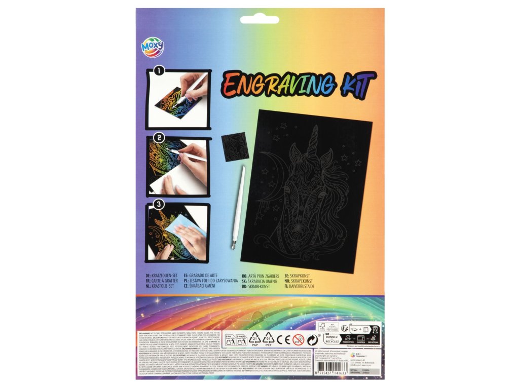 Pomocí přiloženého škrabacího pera seškrábněte černou vrstvu a odhalte nádherný duhový obrázek. Jednoduše sledujte linie nebo seškrábněte plochy podle své fantazie a sledujte, jak se před vašima očima objeví barevný jednorožec. Je to relaxační a zábavná aktivita, která potěší děti i dospělé.