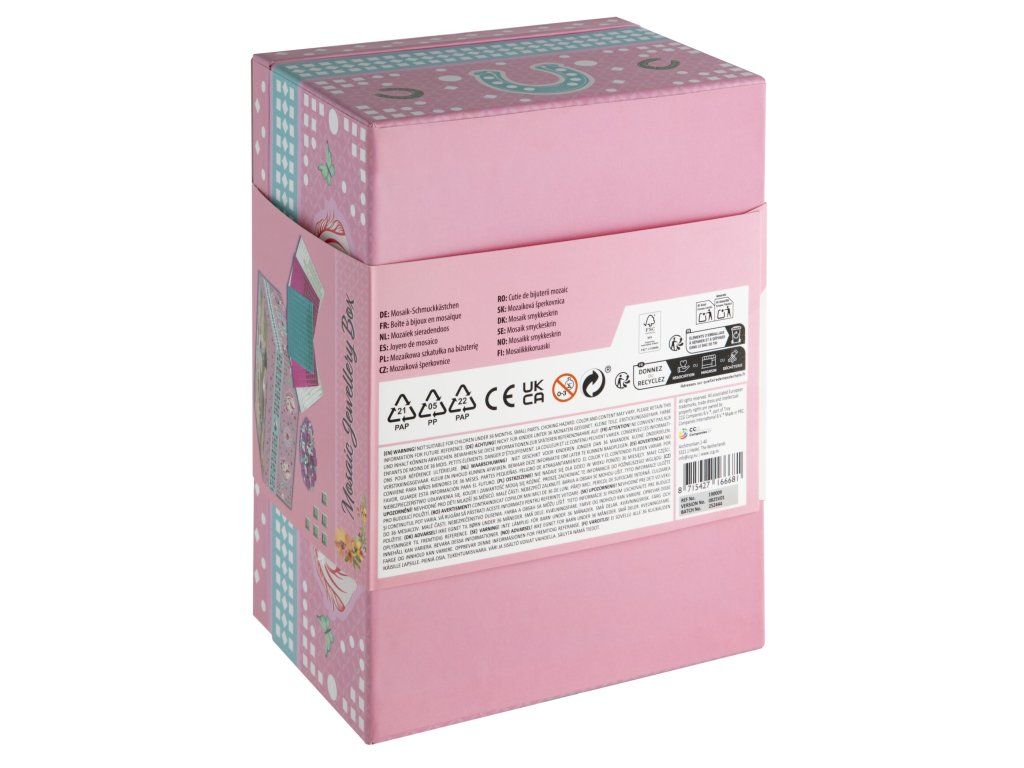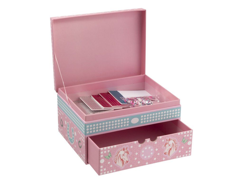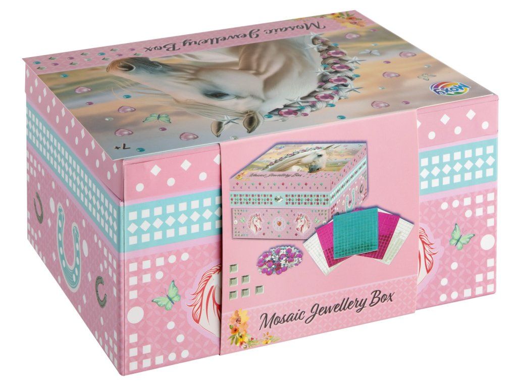 Vytvořte si zářivé království na poklady! Tato kreativní sada vám umožní ozdobit šperkovnici s motivem koně pomocí barevných třpytivých mozaikových čtverečků. Výsledkem bude nádherná, vlastnoručně dekorovaná krabička, která se stane ozdobou každého dívčího pokoje.