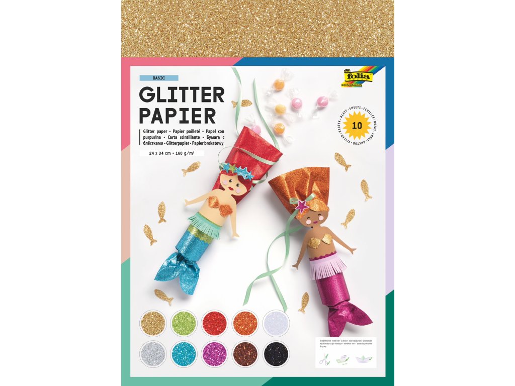 Barevný dekorační papír se třpytkami, jednostranný, 24 x 34 cm. Balení obsahuje 10 archů v různých barvách – ideální pro výrobu přání, scrapbooků, pohlednic a dekorací.