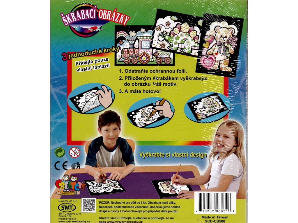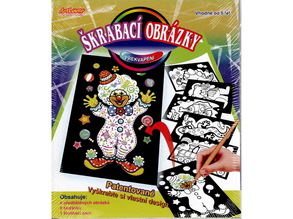 Sada obsahuje 6 předtištěných obrázků, 6 stojánků, škrabací pero. Velikost obrázků 15x10cm. Jednoduché a zábavné, pro děti cca od 6 let.