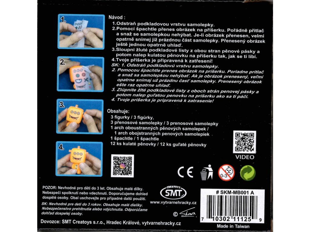 Zatřes! Polep! Uslyšíš! Návod: Odstraň podkladovou vrstvu samolepky. Pomocí dřevěné špachtle přenes obrázek na příšerku.
